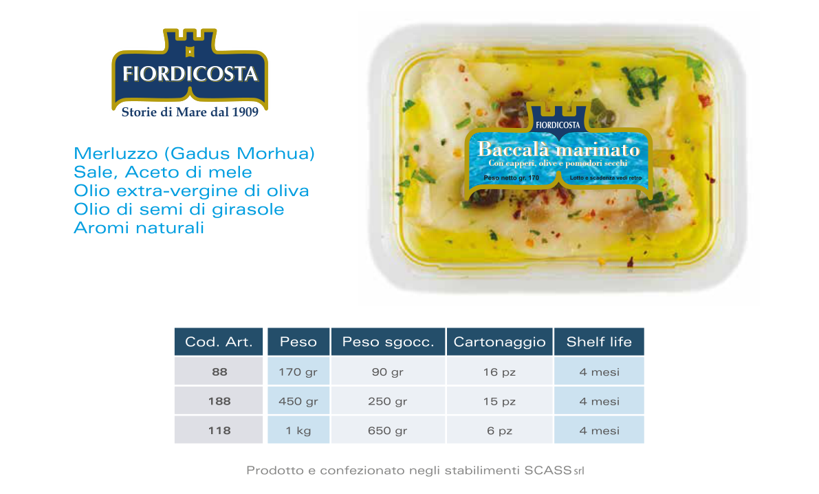 Baccalà Gadus Morhua desalinizzato e marinato secondo tradizione. Un prodotto pratico e pronto all’uso che conserva la purezza del sapore e la morbidezza del pesce.